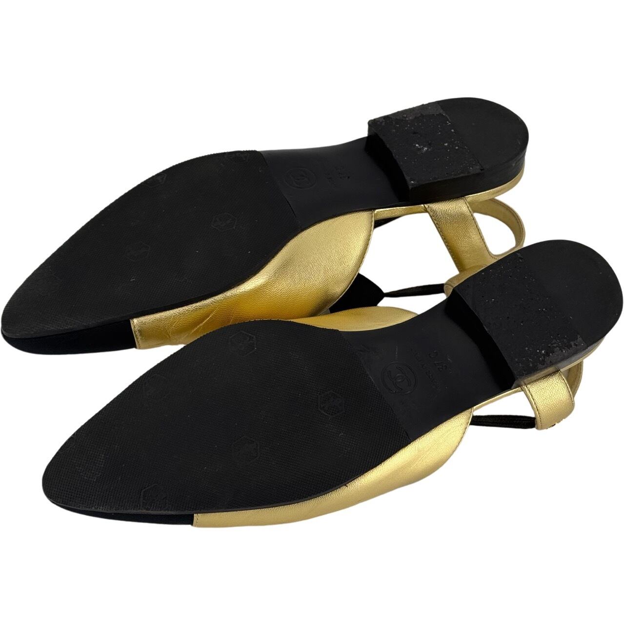 CHANEL シャネル ストラップ フラット パンプス レザー ゴールド/ブラック サイズ37 リボン ココマーク