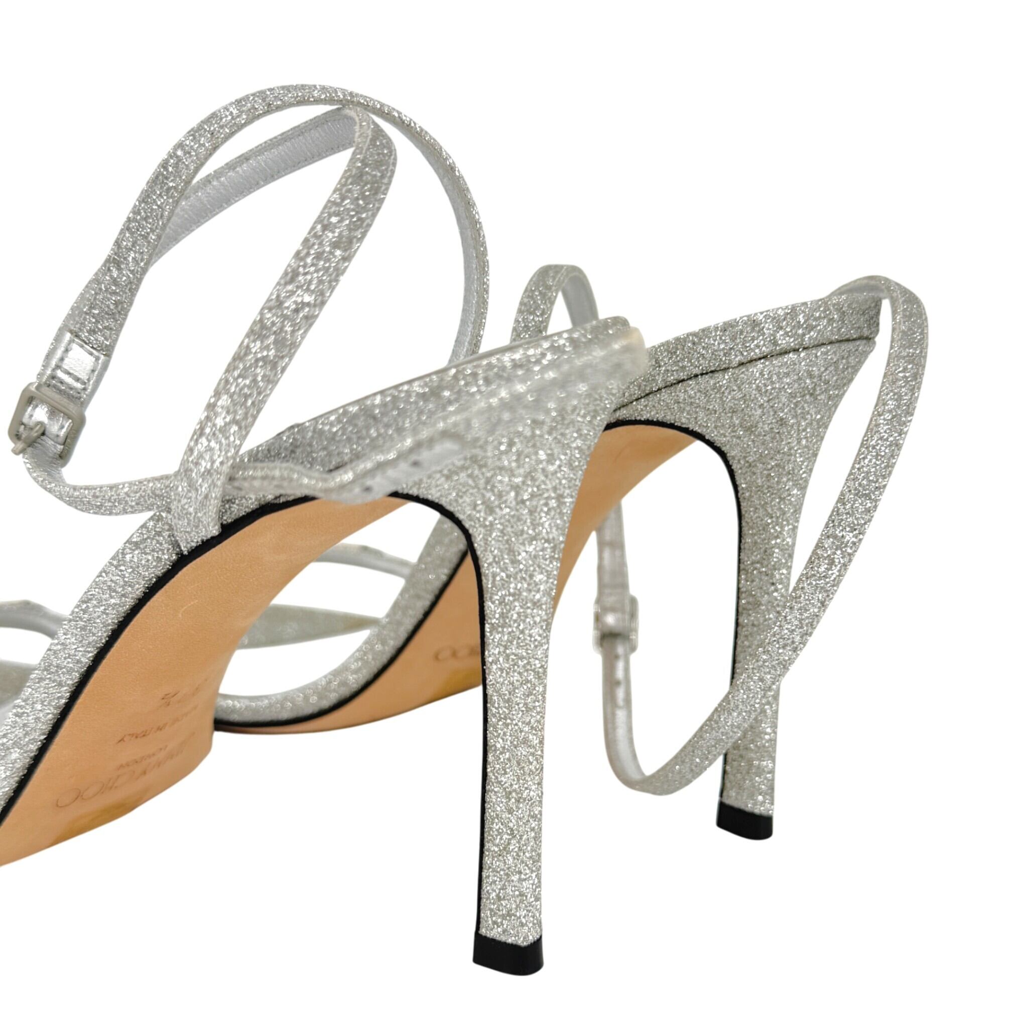 JIMMY CHOO ジミーチュウ Jaxon 95 レザー サンダル #37.5 グリッター加工 シルバー ヒール:100mm ハイヒール 靴 ウェディング レディース 中古